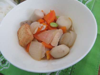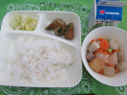 献立は、ちくわの磯辺揚げ、厚揚げと里芋の煮物、あっさりキャベツ、ごはん、牛乳でした。