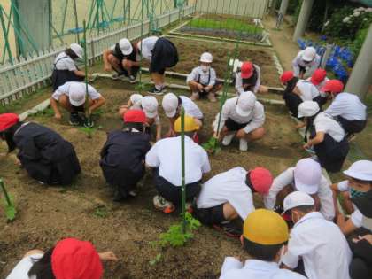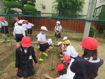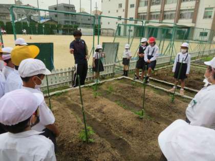 学習園に植えたヘチマ、ヒョウタン、ゴーヤの苗の観察に来ていました。
