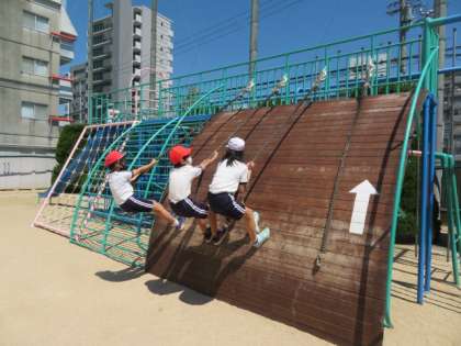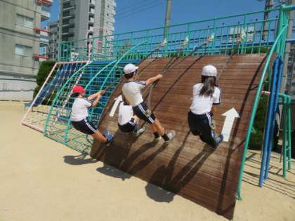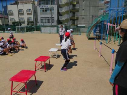 鉄棒運動に向けて、自分の体重を引っ張り上げたり、しっかりつかんだり、適切な着地を意識するための動きを試したりしていました。