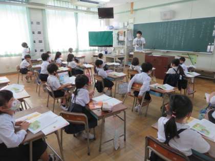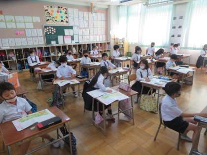 「ぽんたとかんた」の教材で、よいこと悪いことについて自分の身の回りで起こることと合わせて考え合っていました。