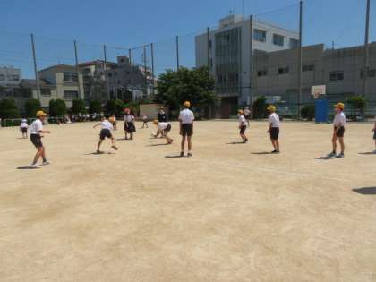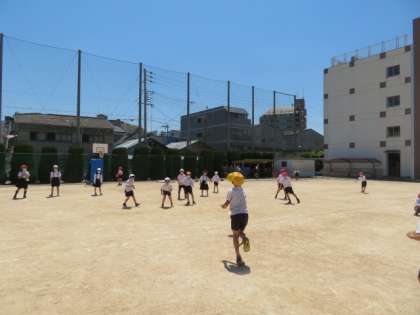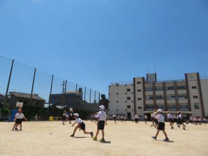 つゆの晴れ間、まさしく五月晴れの一日。休み時間には積極的に運動場へ出て、ボールを使ってそれぞれに運動遊びをしています。