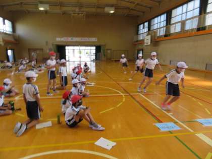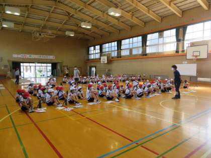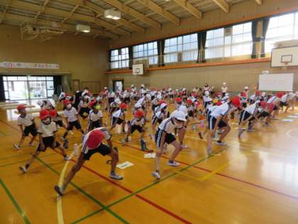講堂に1・6年生が集まり、スポーツテストの説明を受けたり、準備運動をしたりしました。