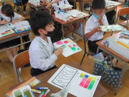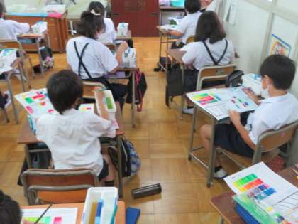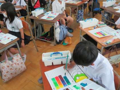 「混色とグラデーション」をテーマとして、始めの色と終わりの色を決めて、その間の色の変化を水彩でグラデーションを意識して彩色していました。