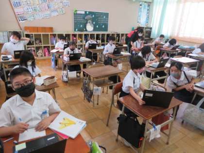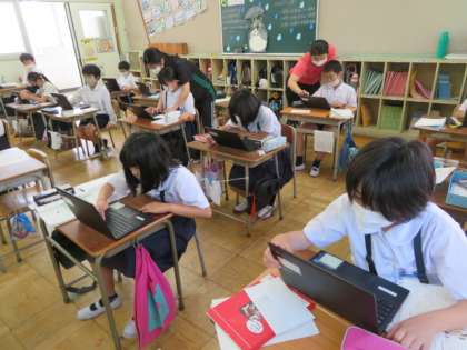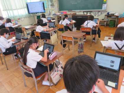 2組も、個人用端末を使ってそれぞれに環境問題に関わる事柄を調べながら、整理してまとめていました。