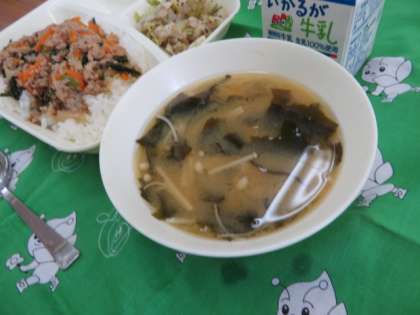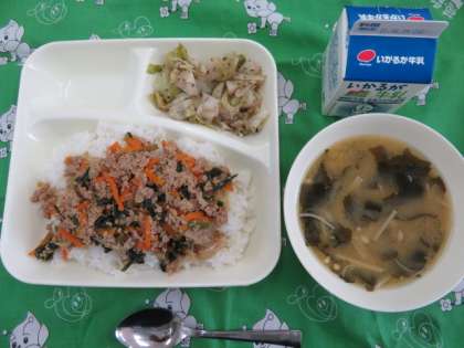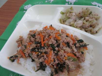 献立は、豚ひき肉とニラのそぼろ丼、みそ汁、キャベツの赤紫蘇あえ、牛乳でした。