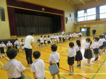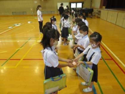 たんけんが終了し、2年生も講堂に集まってきて、最後に2年生の手作り名刺をそれぞれ1年生に手渡しました。
