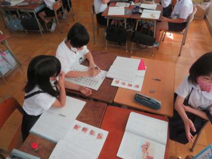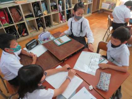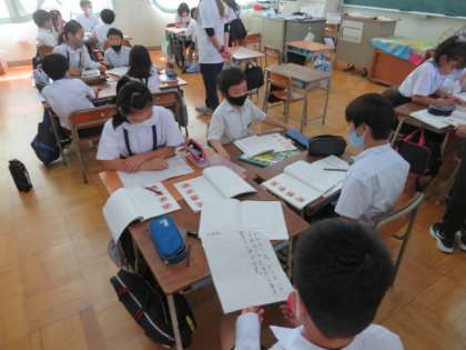 説明文「ヤドカリとイソギンチャク」で、課題についてグループで話し合って意見をまとめて発表しようとしていました。