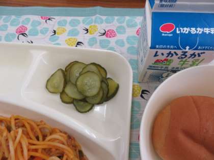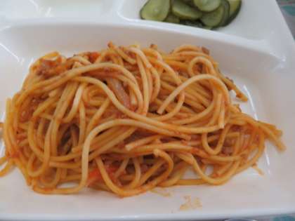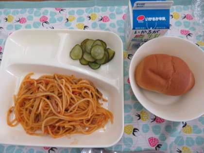 献立は、スパゲッティミートソース、きゅうりのピクルス、1/2黒糖パン、牛乳でした。