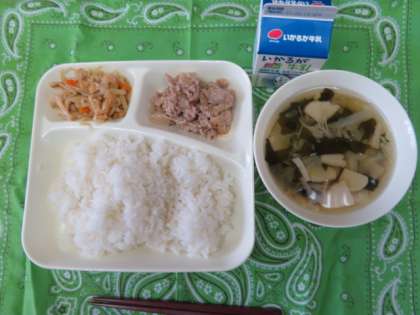 献立は、豚肉の甘辛焼き、すまし汁、切り干し大根の炒め煮、ごはん、牛乳でした。