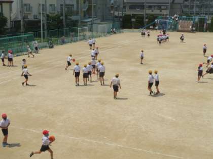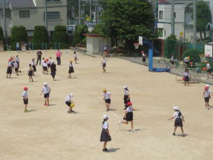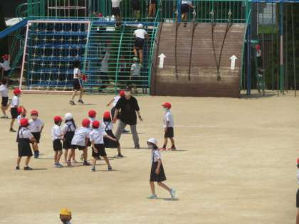 暑くなってきて、熱中症予防対策・コロナ対策を平行して行いながらも多くの子どもたちや先生もまじり、元気いっぱいに運動場で遊んでいます。