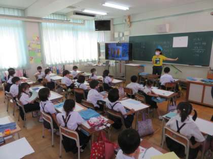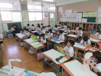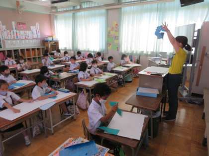 「やぶいた かたちから うまれたよ」というテーマで、画用紙にいろいろな形にやぶいた紙を貼って、偶然と自分のイメージを生かした作品を仕上げていきます。