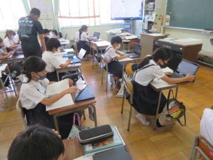 「環境問題について報告しよう」というテーマで、1組では、各自が発表で使う資料を決めるとともに発表原稿の仕上げにかかっていました。