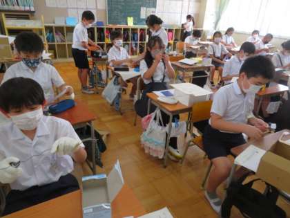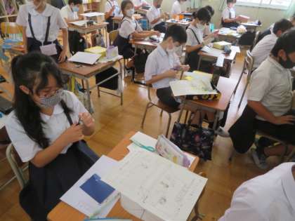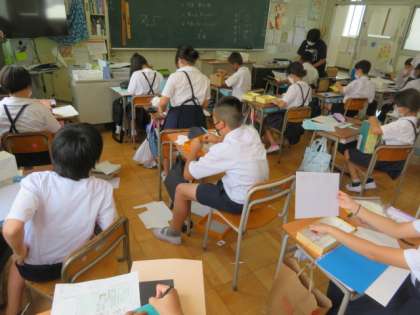 「クランクの働きを使って」というめあてで、動く作品を下絵からおこして作製していました。