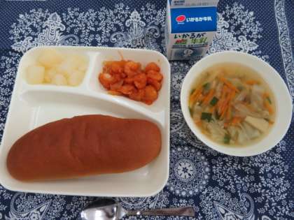 献立は、えびのチリソース、中華スープ、和梨(カット缶)、黒糖パン、牛乳でした。