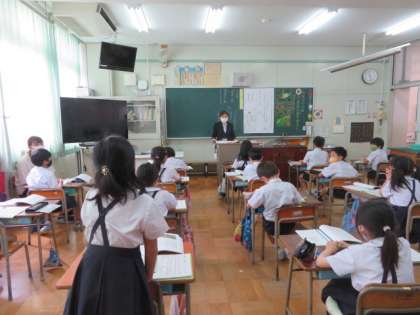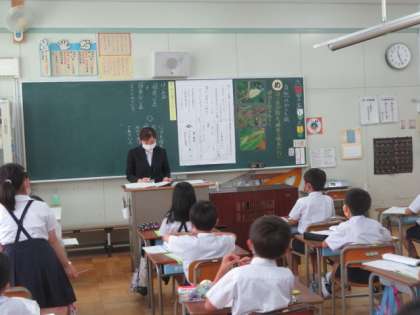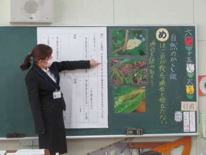 「自然のかくし絵」で、「ほご色が役立つときと役立たない場合について読み取ろう」をめあてに、子どもたちも意欲的に学習に参加していました。