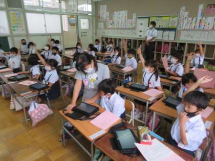 1年生もタブレット端末のいろいろな使い方を楽しみながら学んでいます。