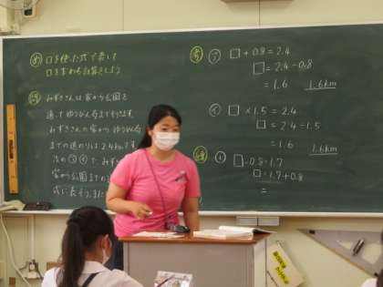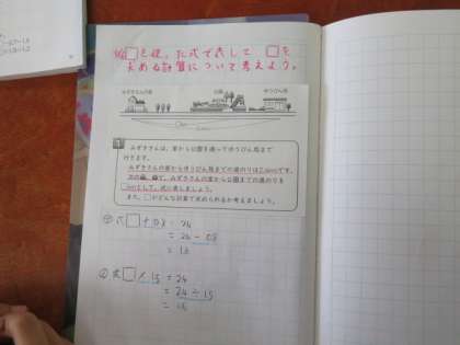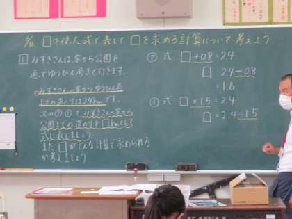 学年を3分割して「□を使った式で表して□を求める計算について考えよう」をめあてにそれぞれの教室で学習を進めていました。