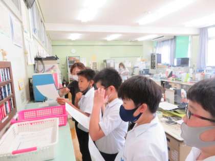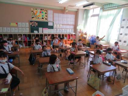 緊急事態宣言発出中は、職員室からの放送で行っています。