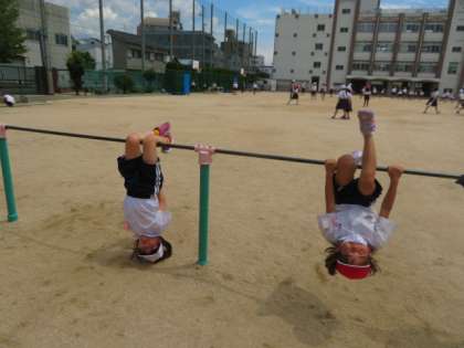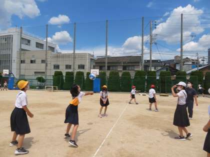 晴れた日の運動場は、大勢の子どもたちが運動場で遊んでいます。