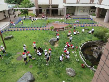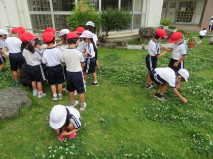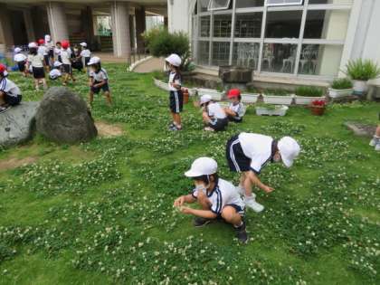 中庭にシロツメ草が群生している状態だったので、草刈をする前に1年生が生活科で紹介されているシロツメ草をつかっての遊びを楽しんでいました。