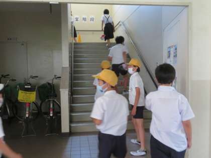 2時間目後の15分休憩に運動場で遊んでいた子どもたちが、右側を意識して階段を上がっていきました。