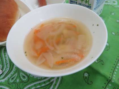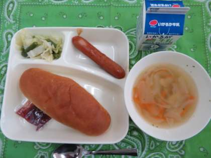 献立は、ウインナーのケチャップソース、スープ、キャベツと三度豆のサラダ、いちごジャム、コッペパン、牛乳でした。