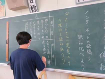 「インターネットの投稿を読み比べる」という教材で、「延長13回232球を投げぬいたエース」という事実に対して、インターネット上に投稿された様々な意見文を取り上げての学習でした。
