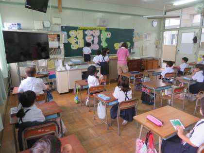 一人一枚ずついろいろな食品カードが配られ、子どもたちはそれをグループ分けされたところに貼りにいきました。