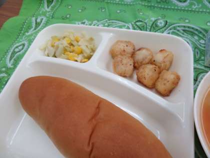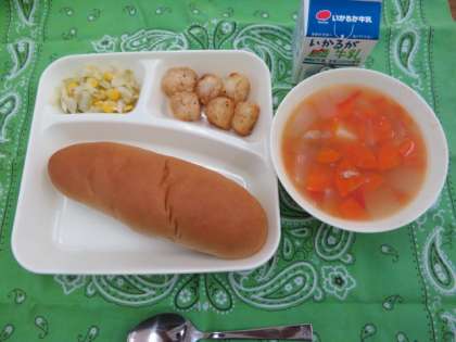 献立は、いか天ぷら、フレッシュトマトのスープ煮、サワーソテー、黒糖パン、牛乳でした。