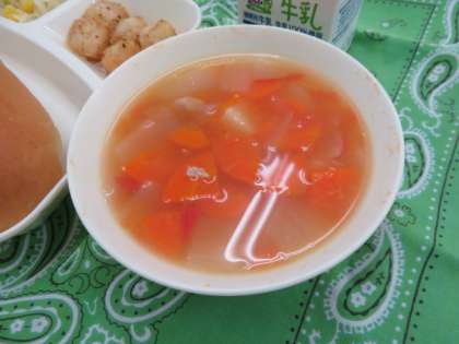 フレッシュトマトのスープ煮は、トマトの酸味がほどよく効いており、ニンジンやジャガイモなどの具材もほど良い柔らかさで、とてもおいしく味わいながらいただきました。
