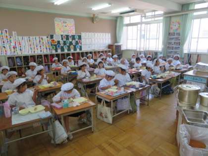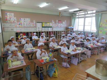 1組も2組の子どもたちも、しっかりと味わいながら給食を食べていました。