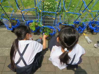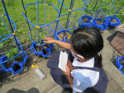 2年生が一人一鉢で栽培しているピーマンとミニトマトにそれぞれ実がついているということを教えてくれました。