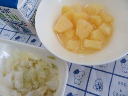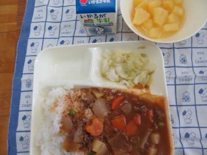 献立は、ハヤシライス、キャベツのゆずドレッシング、パイナップル(缶)、牛乳でした。