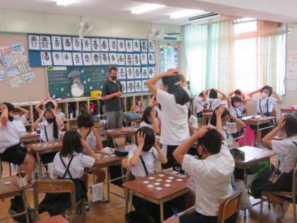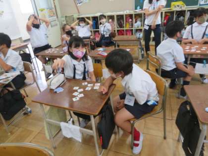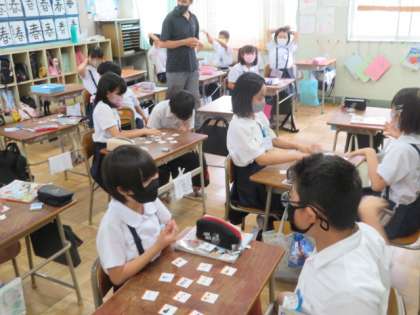 C-NETの先生が答えた教科のカードを聴き取り、二人組で取り合っていました。