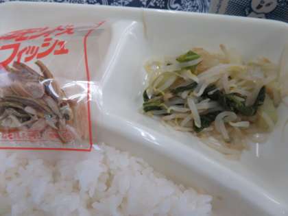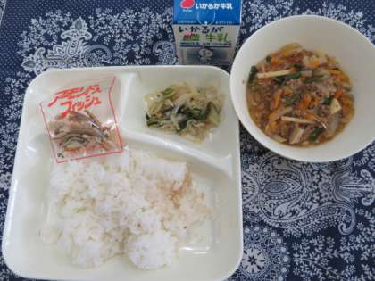 献立は、マーボー春雨、チンゲン菜ともやしの甘酢あえ、アーモンドフィッシュ、ごはん、牛乳でした。