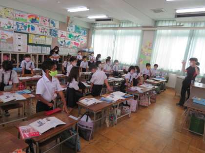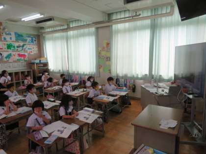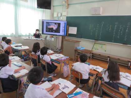ヤマアラシ、アルマジロ、スカンクなどの動物が、どのようにして自分の身を守るのか、読み取ってきたことを動作化したり大型モニターの資料映像を観たりしながらまとめていました。
