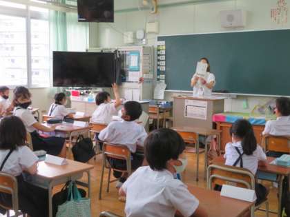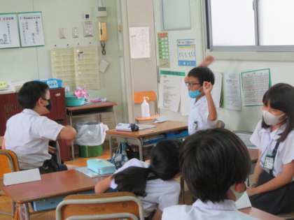 子どもたちが英語であいさつをしたり、簡単なじゃんけんをしたりして、英語での活動の雰囲気を高めていました。