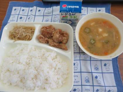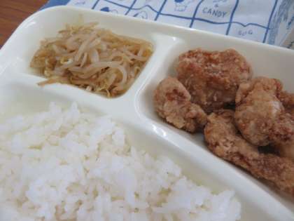献立は、豚肉の香味揚げ、みそ汁、もやしのおひたし、ごはん、牛乳でした。