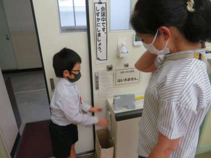 「おって たてたら」の作品ができあがったので、職員室まで見せに来てくれました。