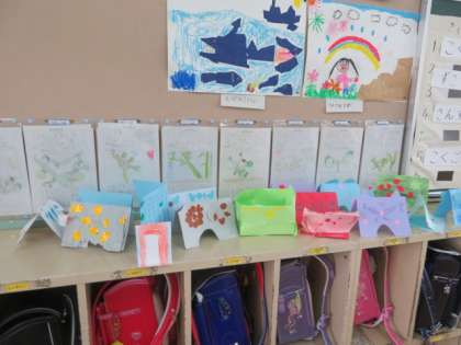 1年1組教室後ろのロッカーの上にみんなの作品が飾られていました。