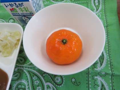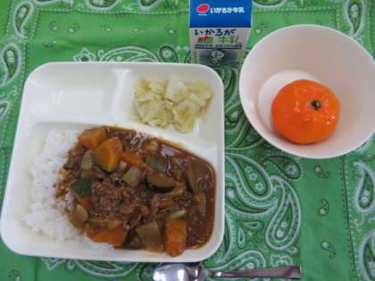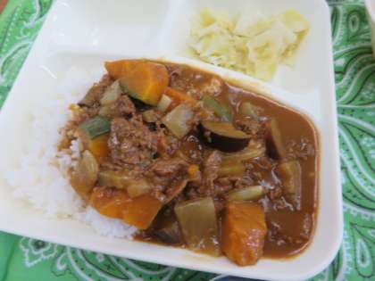 献立は、夏野菜のカレーライス、キャベツのサラダ、冷凍みかん、牛乳でした。