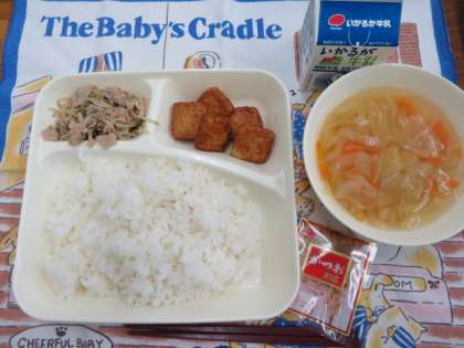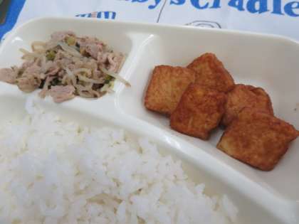 献立は、ゴーヤーチャンプルー、すまし汁、厚揚げのしょうが醤油かけ、ごはん、牛乳でした。