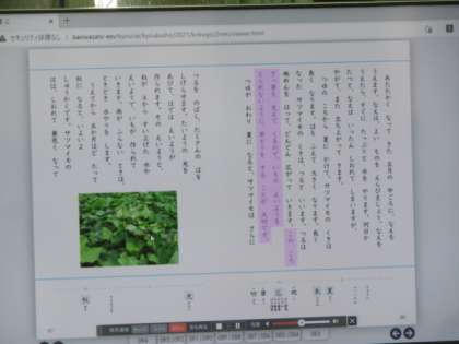 「サツマイモのそだて方」で、二つの文しょうのちがいを見つけようをめあてとして大型モニターにデジタル教科書を映しながら学習を進めていました。