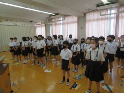 自然体験学習(林間学習)に向けて、音楽の時間に1・2組合同でキャンファイヤー時に歌う歌の練習をしていました。