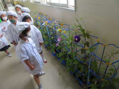 1年生の教室前廊下には、個人懇談会の際に持って帰っていただくアジサイの鉢が並べてあります。