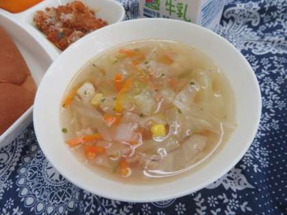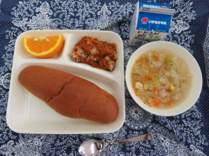 献立は、かぼちゃのミートグラタン、スープ、オレンジ、黒糖パン、牛乳でした。