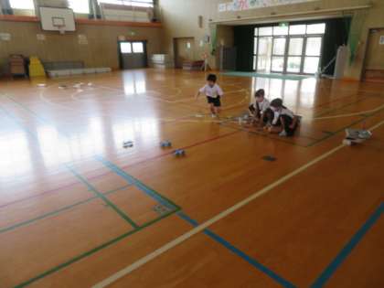 「ゴムのはたらき」を生かした車のキットを使って、ゴムの特性についていろいろと学んでいました。
