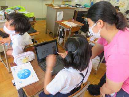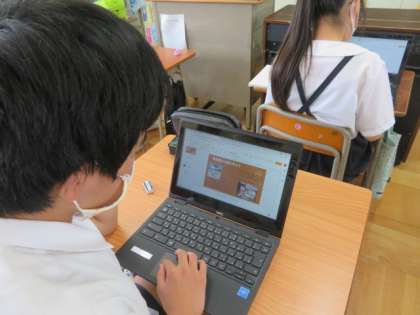 「防災ポスターを作ろう」ということで、インターネットで情報やヒントになる事柄を調べたり、図や表、グラフなどを確認したりしていました。
