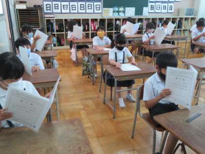 各ご家庭におかれましては、通知表をもとにお子様が一学期にがんばったところを認めてほめてやってください。そして、夏休みには、自由な時間を一学期の反省を生かして計画的・有意義にすごし、二学期始業式にまた子どもたちが元気な姿を見せてくれることを願っています。