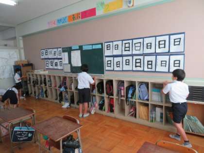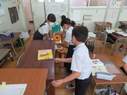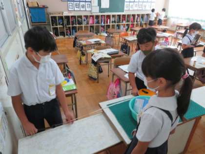 「まきじゃくを使って長さをはかろう」「長さのはかり方や長い長さについて調べていこう」ということをめあてに、巻き尺を使って教室の縦や横の長さなどを測っていました。